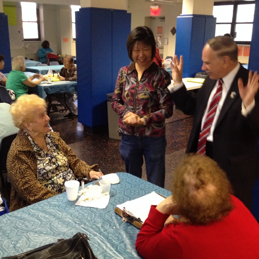 Assemblymember William Colton and community relations Director Nancy Tong with seniors at Marlboro Senior Center.